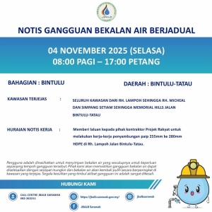 BINTULU: Jabatan Bekalan Air Luar Bandar (JBALB) memaklumkan akan berlaku gangguan bekalan air berjadual pada 4 November...