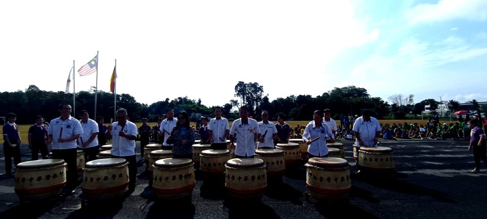 SIMBOLIK…Rose Edward Tarang bersama barisan Guru Besar bagi setiap sekolah rendah memukul gendang 24 musim bagi merasmikan Kejohanan Olahraga Zon Baram Hilir. Foto : JIKU JUGUONG