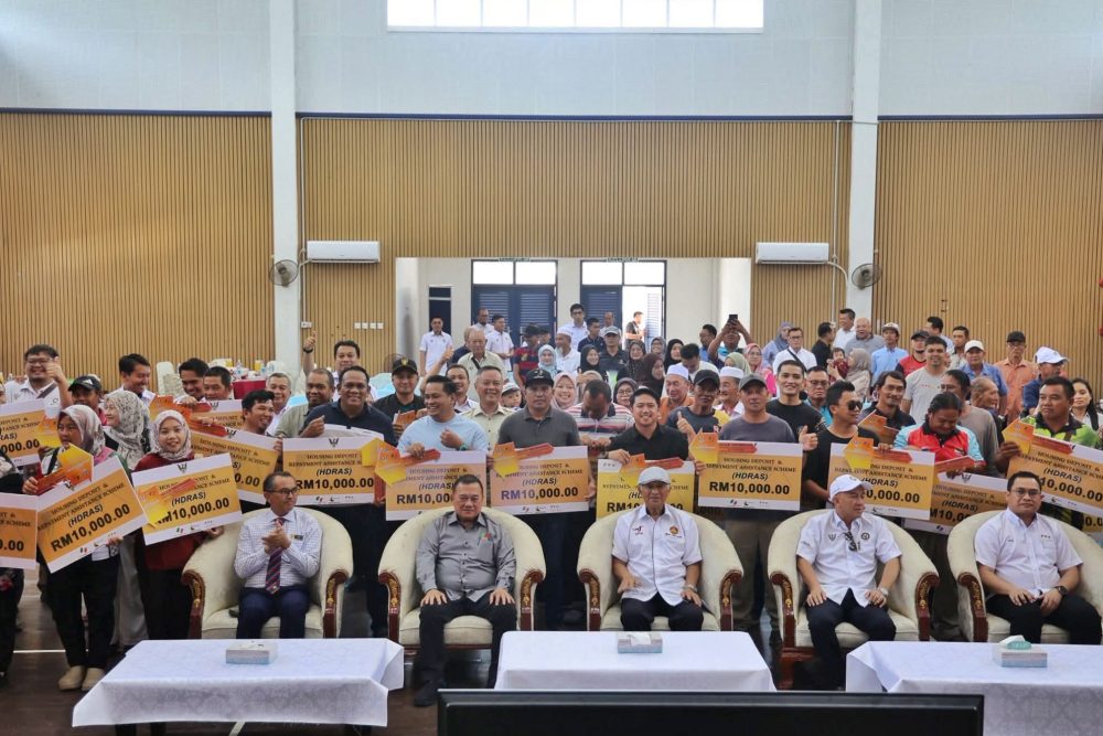 KABONG: Seramai 34 bakal pemilik rumah Rumah Spektra Permata (RSP) Hulu Kabong menerima replika kunci rumah masing-masing dalam Majlis Penyerahan Kunci RSP Skim Pembesaran Kampung (SPK) Hulu Kabong, di Dewan Balai Polis Kabong, pagi tadi.