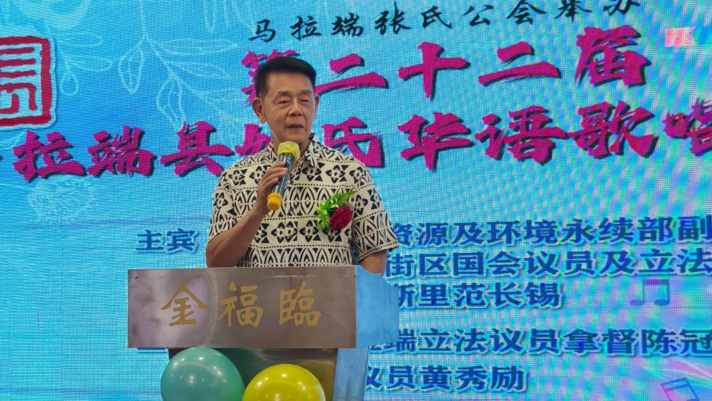 UCAPAN…. Datuk Ding Kuong Hiing berucap di pertandingan nyanyian Persatuan Zhang Daerah Meradong. Foto Pusat Khidmat Wakil Rakyat Meradong
