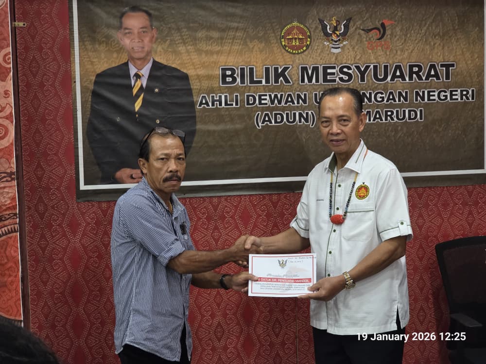 Cek MRP itu telah diserahkan oleh Ahli Dewan Undangan Negeri (ADUN)  Marudi,  Datuk Penguang Manggil, dalam satu majlis penyerahan di Bilik Mesyuarat Pusat Khidmat ADUN N76 Cawangan Beluru, hari ini.