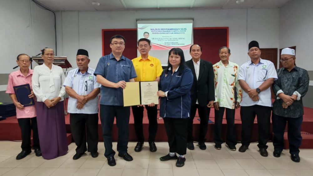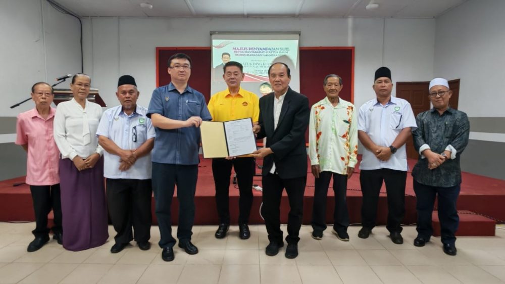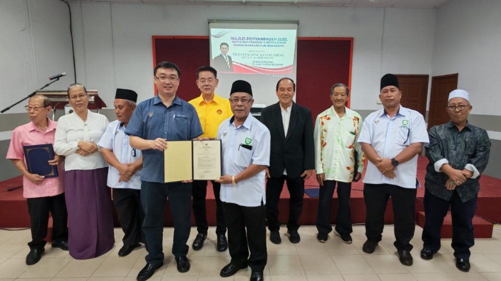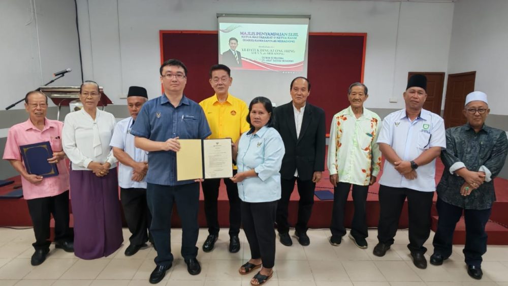 ADUN Meradong, Datuk Ding Koung Hiing menyaksikan penyampaian sijil pelanjutan semula dan pelantikan baharu KMKK. Foto Pusat Khidmat Meradong
