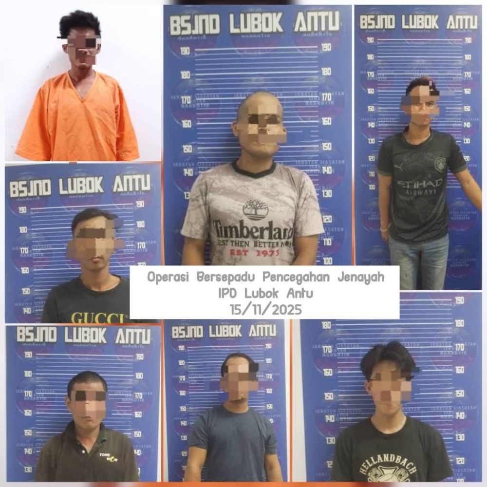 LUBOK ANTU: Tujuh lelaki tempatan berusia antara awal 20-an hingga awal 40-an ditahan polis dalam Op Tapis Khas/Op Bersepadu Pencegahan Jenayah dijalankan Ibu Pejabat Polis Daerah (IPD) Lubok Antu di sekitar Engkilili dan Lubok Antu, semalam.