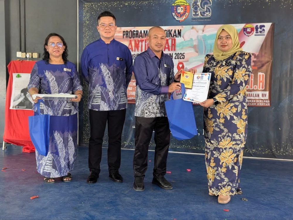 TERIMA KASIH… Penceramah dari Unit Pencegahan AADK Daerah Miri, Syahrul Abu Bakar menerima cenderahati daripada pihak SK Lambir Village, semalam.
