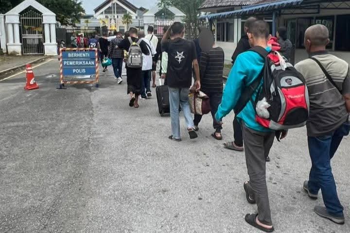 PULANG… Anggota Jabatan Imigresen Malaysia dari Depot Tahanan Imigresen Bekenu melaksanakan penghantaran pulang 94 warga asing melalui Pos Kawalan Imigresen Tebedu – Entikong, 30 September hingga 1 Oktober lalu.