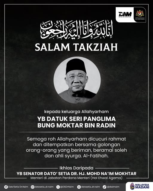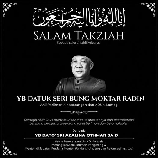 KUALA LUMPUR: Timbalan Perdana Menteri Datuk Seri Fadillah Yusof serta barisan menteri Kabinet dan menteri besar hari ini mengucapkan takziah kepada keluarga Ahli Parlimen Kinabatangan Datuk Seri Bung Moktar Radin yang meninggal dunia awal pagi tadi.
