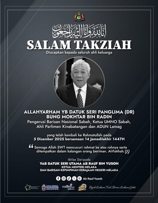 Ketua Menteri Melaka Datuk Seri Ab Rauf Yusoh ketika berucap pada pembentangan Bajet Melaka 2026 di Dewan Undangan Negeri hari ini turut menzahirkan ucapan takziah kepada keluarga Bung Moktar.