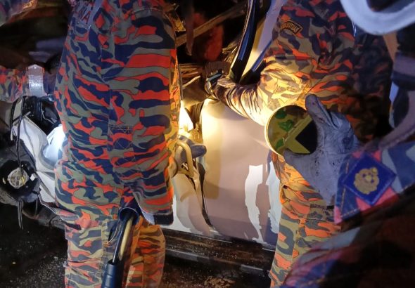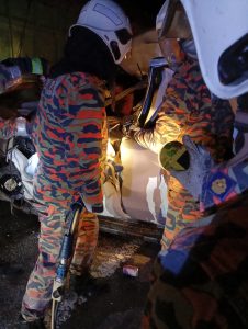 PASUKAN BOMBA….Menjalankan operasi mengeluarkan mangsa yang tersepit dalam kemalangan berhampiran Bulatan Dudong Jalan Sibu-Durin, malam tadi. Foto...