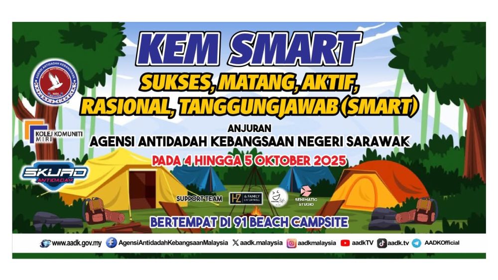 MIRI: Agensi Anti Dadah Kebangsaan (AADK) dengan kerjasama Kolej Komuniti dan Skuad Antidadah Miri akan menganjurkan Kem SMART (Sukses, Matang, Aktif, Rasional, Tanggungjawab) bertemakan perkhemahan santai di pantai pada 4 hingga 5 Oktober 2025 ini.