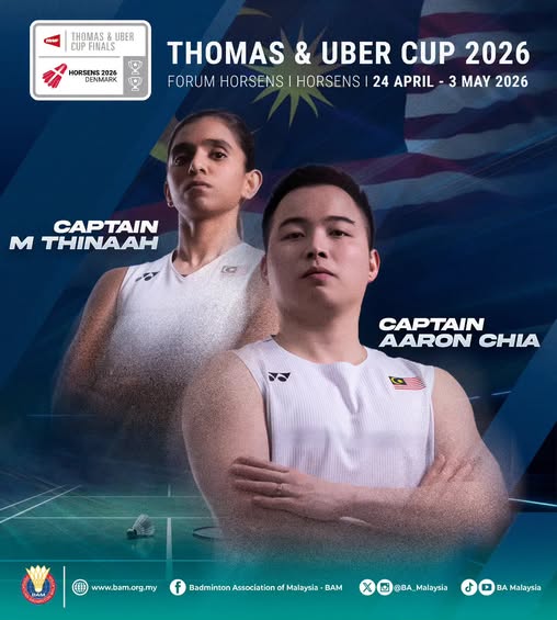 KUALA LUMPUR: Pemain badminton negara, Aaron Chia dan M. Thinaah akan mengetuai cabaran Malaysia pada pusingan akhir Piala Thomas dan Piala Uber 2026 di Horsens, Denmark.