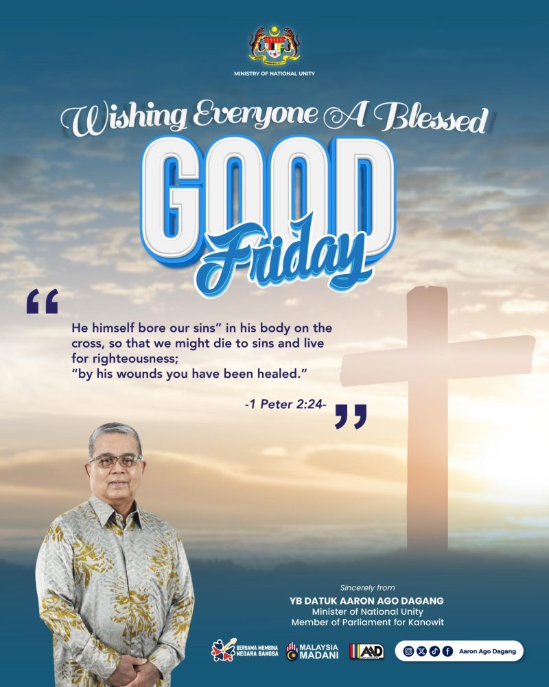 KUALA LUMPUR: Menteri Perpaduan Negara Datuk Aaron Ago Dagang mengucapkan selamat menyambut Good Friday kepada seluruh rakyat Malaysia yang meraikan perayaan tersebut, hari ini.