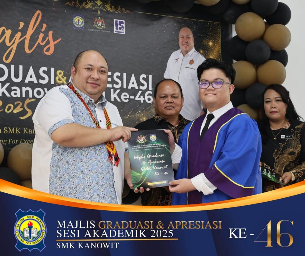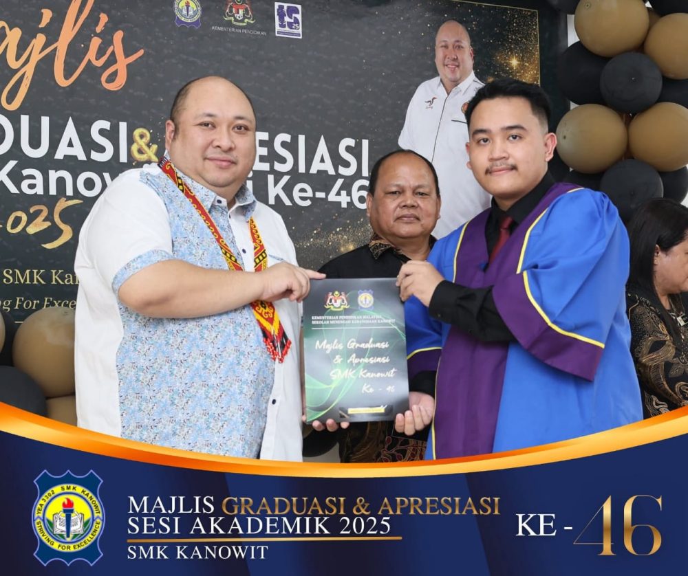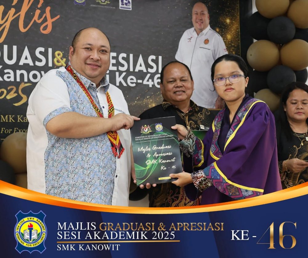 TAHNIAH….Allan menyampaian sijil kepada pelajar Tngkatan 6 Semester 3 pada Majlis Graduasi dan Aspresiasi SMK Kanowit Kali Ke-46 bagi 2025.