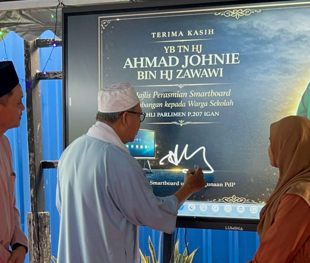 RASMI… Ahmad Johnie merasmikan papan putih Smartboard sumbangan kepada warga SK Kampung Pergau bagi menyokong kaedah pembelajaran lebih interaktif dan selari dengan keperluan pendidikan masa kini. Foto Facebook Parlimen P207 Igan