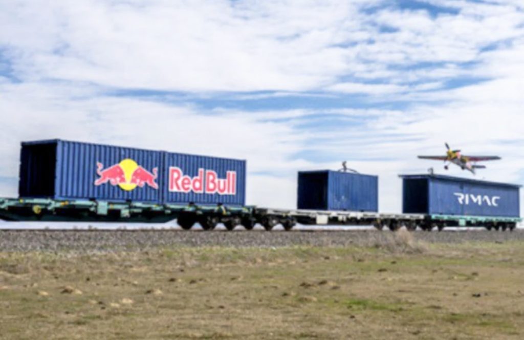 Pesawat Zivko Edge 540 yang diterbangkan Costa mendarat secara menakjubkan di atas gerabak kereta api. Foto Redbull.com