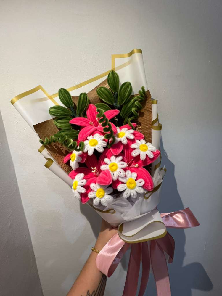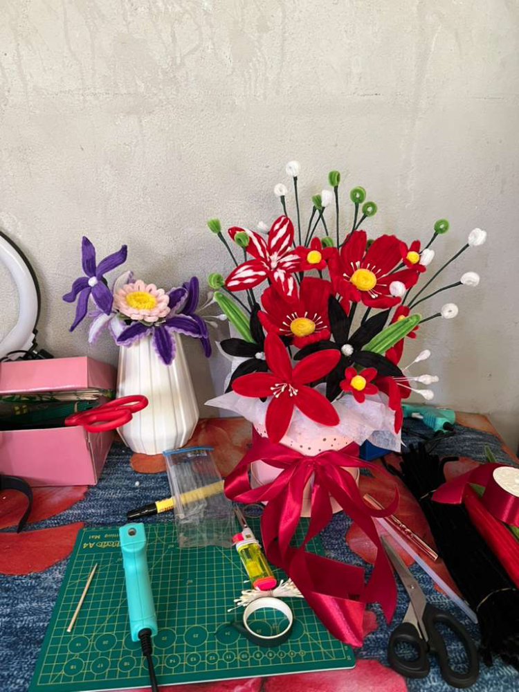 Setiap bunga ciptaannya bukan sekadar hiasan, tetapi membawa cerita. Alyssa menggunakan chenille stem — dawai fleksibel berbulu lembut — sebagai medium yang halus namun kukuh.