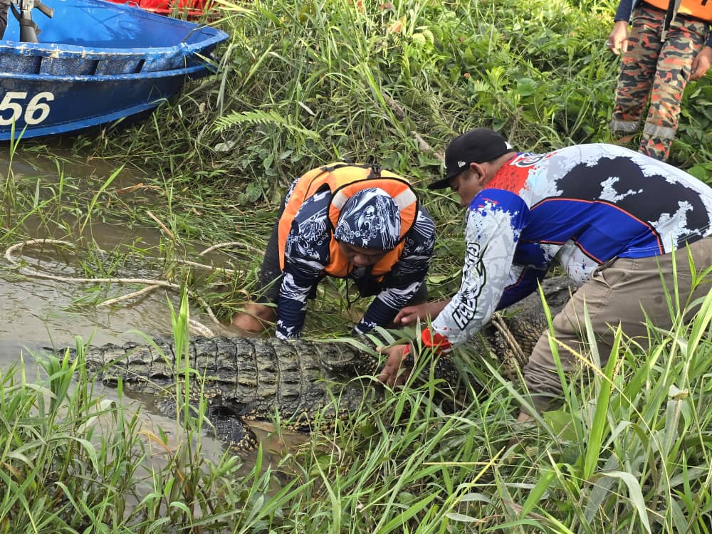 “Seekor buaya katak jenis Crocodylus porosus jantan sepanjang 15 kaki dengan anggaran berat 300 hingga 400 kilogram berjaya ditangkap dan dibawa ke darat sebelum disimpan di Pusat Operasi,” katanya.