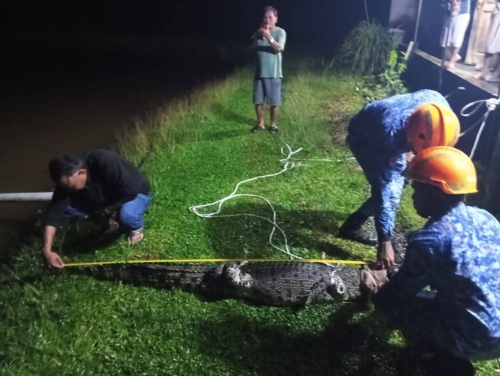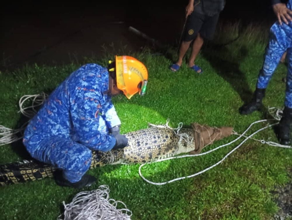Dalam tempoh kurang lapan minit, dua anggota APM berjaya menangkap seekor buaya sepanjang kira-kira tujuh kaki dengan anggaran berat 60 kilogram menggunakan teknik menjerut yang telah dilatih.