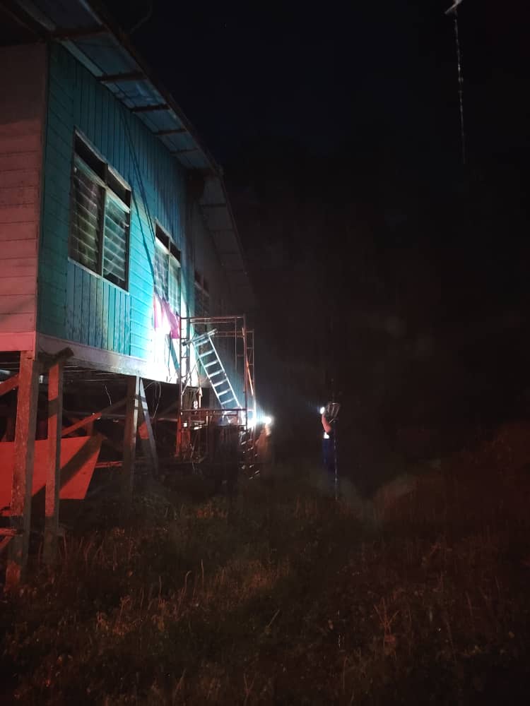 LIMBANG: Anggota Angkatan Pertahanan Awam (APM) Daerah Limbang memanjat setinggi enam meter untuk memusnahkan sarang tebuan sebesar tayar Kancil di rumah seorang penduduk di Kampung Reda, Jalan Kubong, semalam.