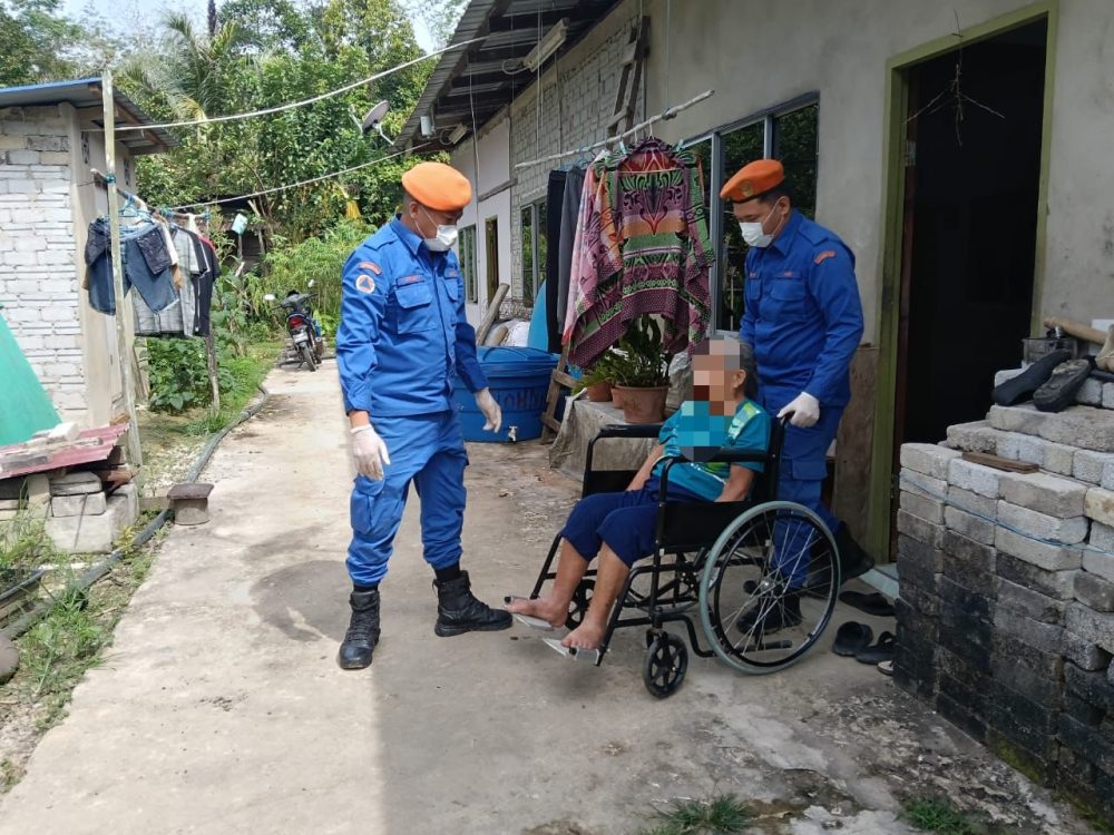 ANGGOTA APM Lubok Antu bantu seorang wanita warga emas yang mengalami lemah seluruh anggota badan di Rumah Lenja Sekandis, Kesit, hari ini. Foto: APM Lubok Antu