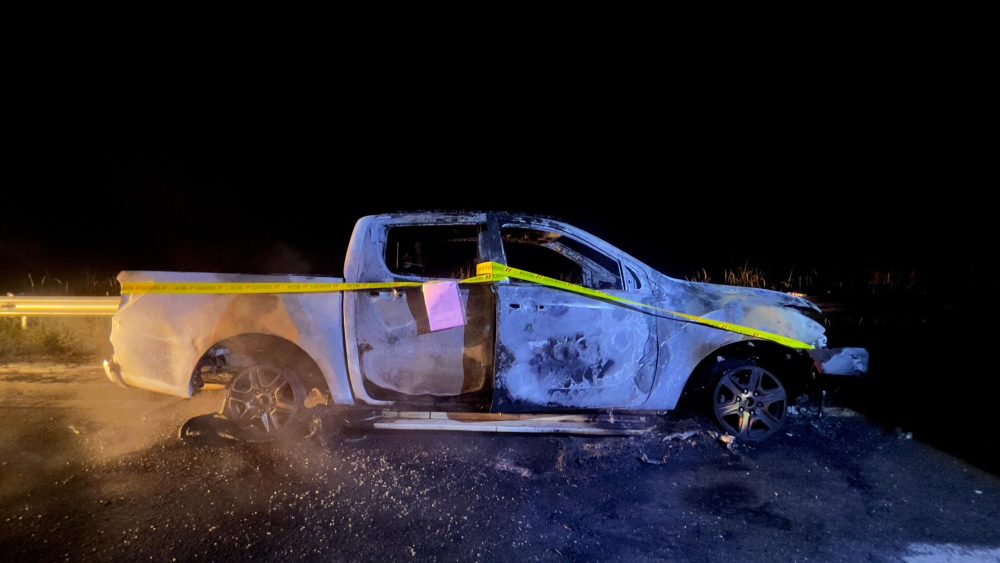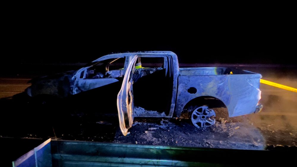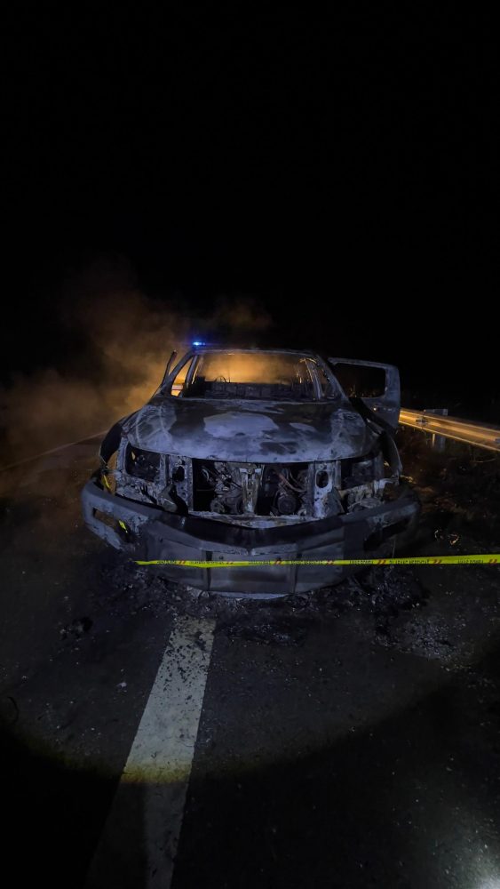 MUSNAH… Sebuah pacuan empat roda (4WD) jenis Mazda musnah sepenuhnya dalam kejadian kebakaran di KM 846.5 Lebuh Raya Pan Borneo Bintulu–Miri awal pagi tadi.
