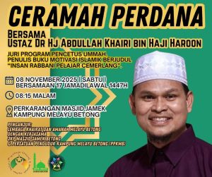 BETONG: Orang ramai dijemput hadir beramai-ramai ke Program Ceramah Perdana bersama Ustaz Dr Abdullah Khairi Haroon yang...