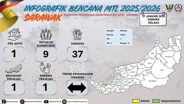 KUCHING: Sebanyak 37 mangsa banjir daripada sembilan keluarga dari Kampung Serunyuk masih berlindung di sebuah pusat pemindahan sementara (PPS) di Sarawak, setakat pagi ini.