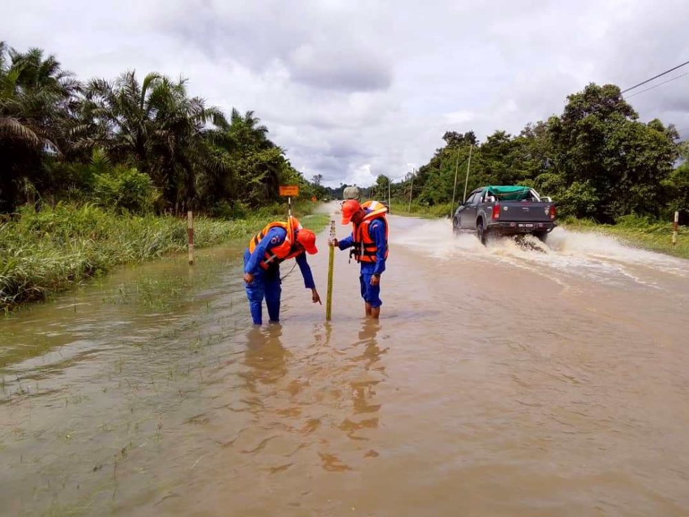 PANTAU…Angkatan Pertahanan Awam Malaysia Daerah Beluru memantau banjir di jalan Sg Bok Bakong
