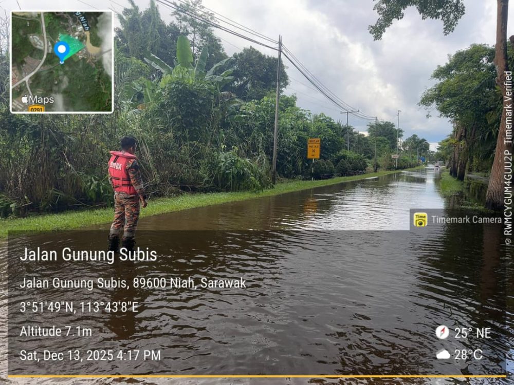 PANTAU… Anggota BBP Batu Niah ketika menjalankan pemantauan banjir di dua laluan utama sekitar Sepupok dan Batu Niah hari ini. Foto BBP Batu Niah