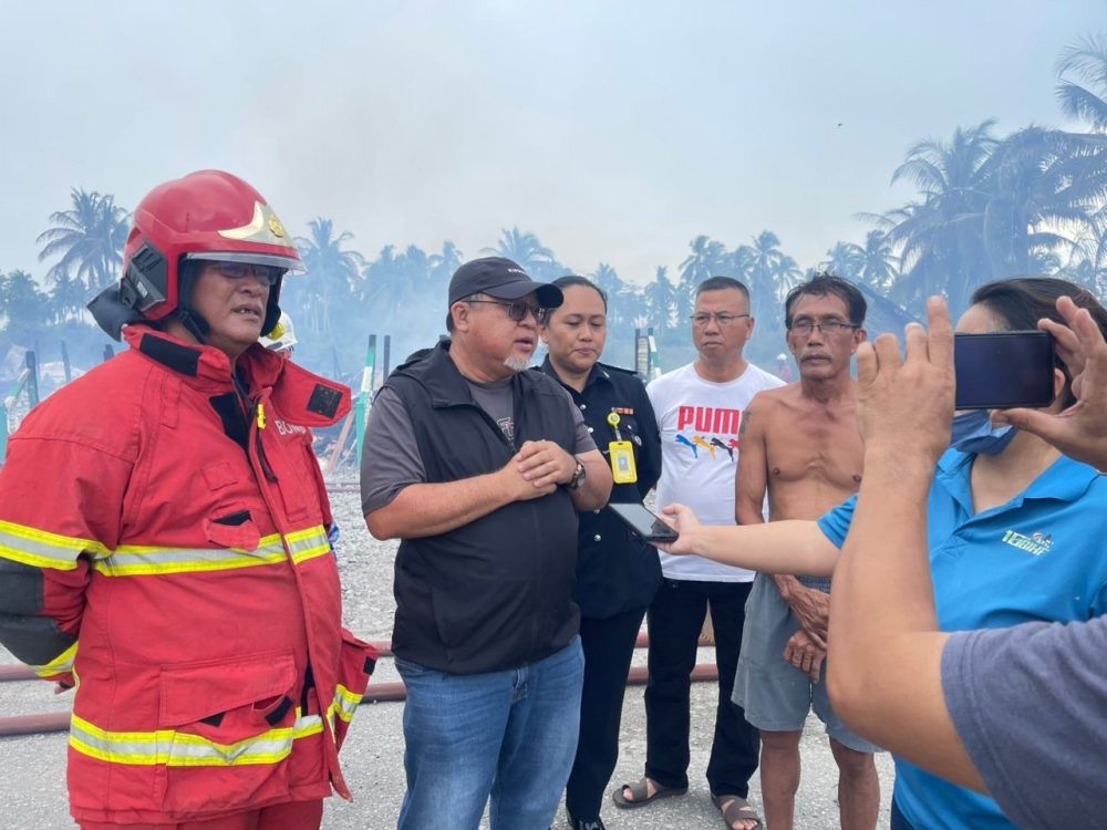ADUN Jepak, Iskandar Turkee meninjau lokasi kebakaran bersama anggota bomba dan agensi berkaitan bagi menyelaras bantuan kepada mangsa di Rumah James Kalip, Sungai Semanok di Jalan Pesisir Jepak-Kuala Tatau, hari ini.