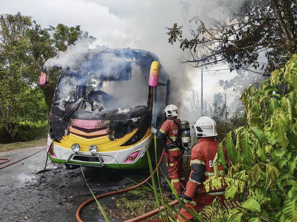 Tambahnya, setibanya pasukan bomba diketuai Komander Operasi, PBK II TBK I Santia Silon, di lokasi, didapati sebuah bas sedang marak terbakar.