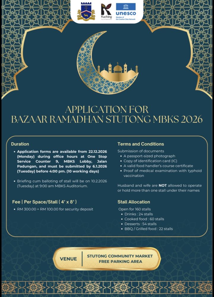 “Borang permohonan boleh diperoleh mulai 22 Disember 2025 di Kaunter Perkhidmatan Setempat 9, lobi Dewan Bandaraya Kuching Selatan, Jalan Padungan, dan hendaklah dikemukakan selewat-lewatnya 4.00 petang pada 6 Januari 2026.