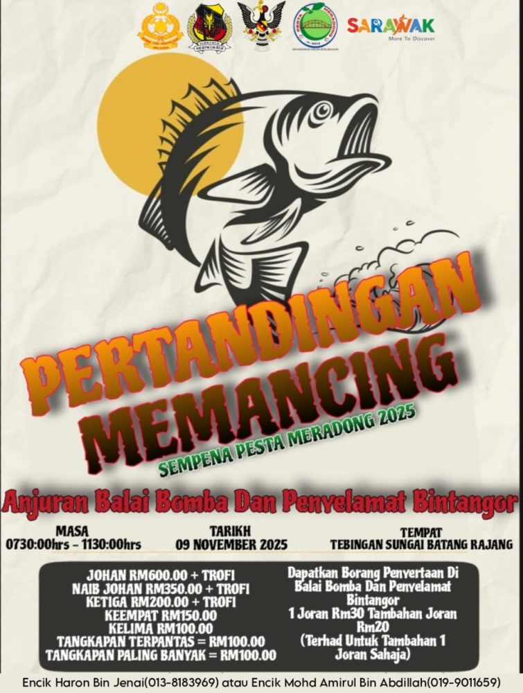 BINTANGOR: Tebingan Sungai Batang Rajang dijangka menjadi tumpuan peminat memancing apabila Balai Bomba dan Penyelamat (BBP) Bintangor menganjurkan pertandingan memancing sempena Pesta Meradong 2025 pada 9 November ini.