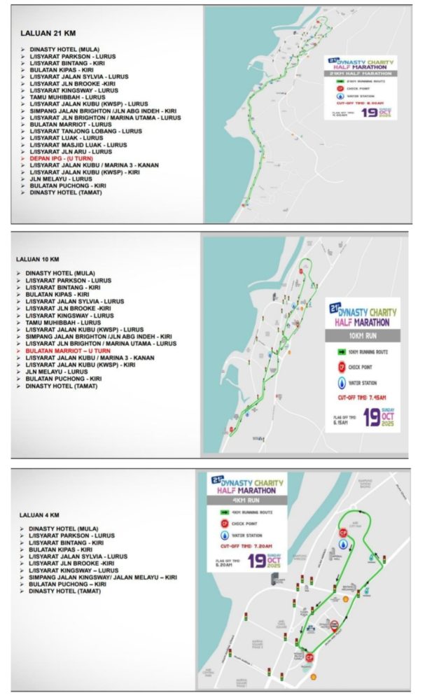 MIRI: Beberapa jalan utama di sekitar bandar raya Miri akan ditutup dan dilencongkan secara berperingkat pada Ahad ini bagi memberi laluan kepada penganjuran Larian Separuh Maraton Amal Dynasty 2025.