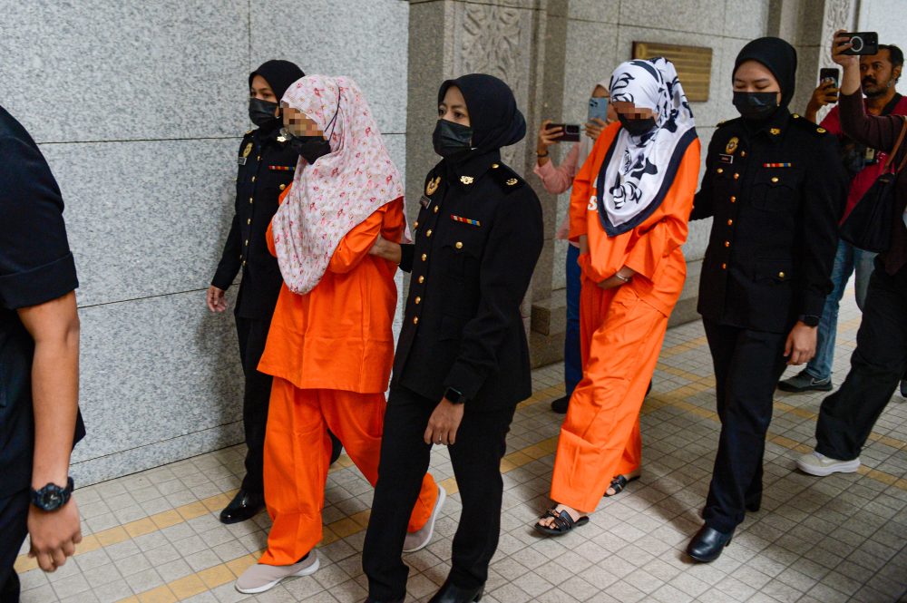 Ketiga-tiga individu, yang memakai baju lokap SPRM berwarna oren, kemudian dibawa memasuki kompleks mahkamah oleh pegawai SPRM.