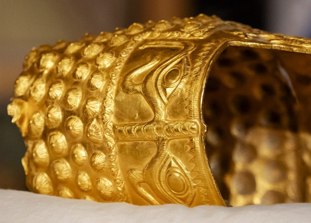 Diapit oleh anggota polis yang memakai penutup muka, jurucakap pendakwa raya Belanda memperlihatkan Topi Keledar Cotofenesti emas dari abad ke-5 Sebelum Masihi serta dua daripada tiga gelang emas yang dicuri pada Januari 2025.