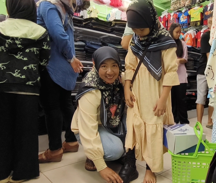 CUBA…Suliyanti Simpol sedang  memakaikan kasut sekolah pada anak kembarnya Syazwan Farwizah semasa membeli barang keperluan sekolah di pasar raya Hari-Hari di Miri hari ini.