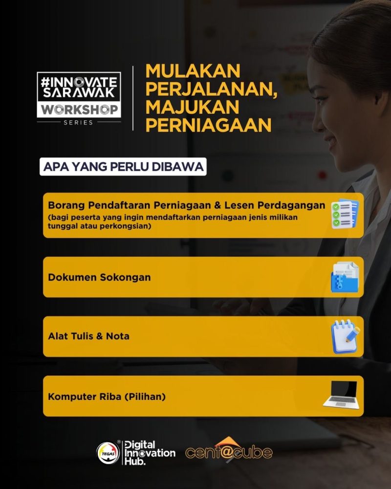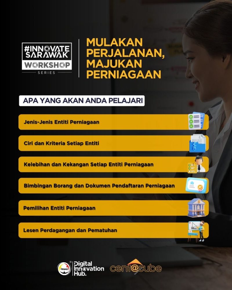 Bengkel yang akan berlangsung pada 7 Februari depan, dari 9.00 pagi hingga 5.30 petang di Hab Inovasi Digital TEGAS (TDIH), Miri, memberi pendedahan menyeluruh mengenai proses pendaftaran perniagaan termasuk pengisian borang dan dokumentasi, pemilihan struktur perniagaan yang sesuai, keperluan lesen serta pematuhan peraturan, selain persediaan awal penubuhan syarikat.