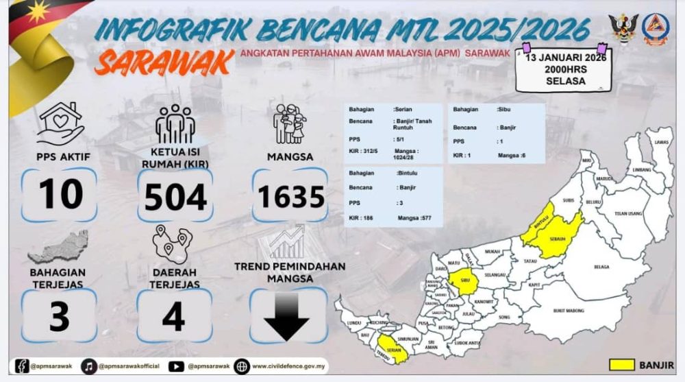 INFOGRAFIK bencana banjir Sarawak yang dikeluarkan setakat 8.00 malam ini. Foto: APM Sarawak