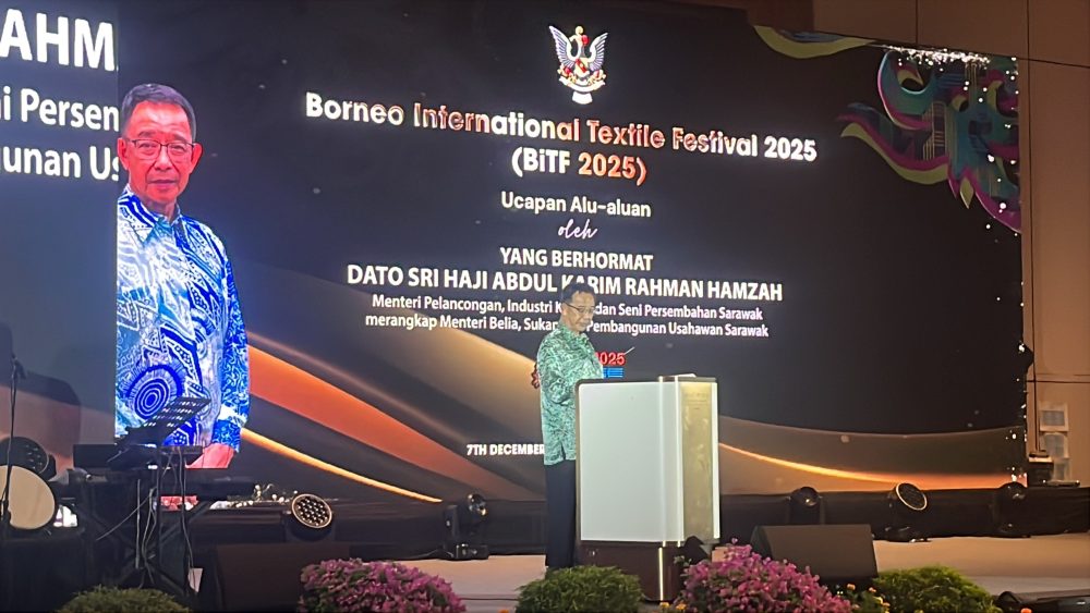 MENTERI Pelancongan, Industri Kreatif dan Seni Persembahan, Dato Sri Abdul Karim Rahman Hamzah menyampaikan ucapan semasa Majlis Perasmian Festival Tekstil Antarabangsa Borneo (BiTF) 2025 di sebuah hotel terkemuka di Kuching, malam ini.