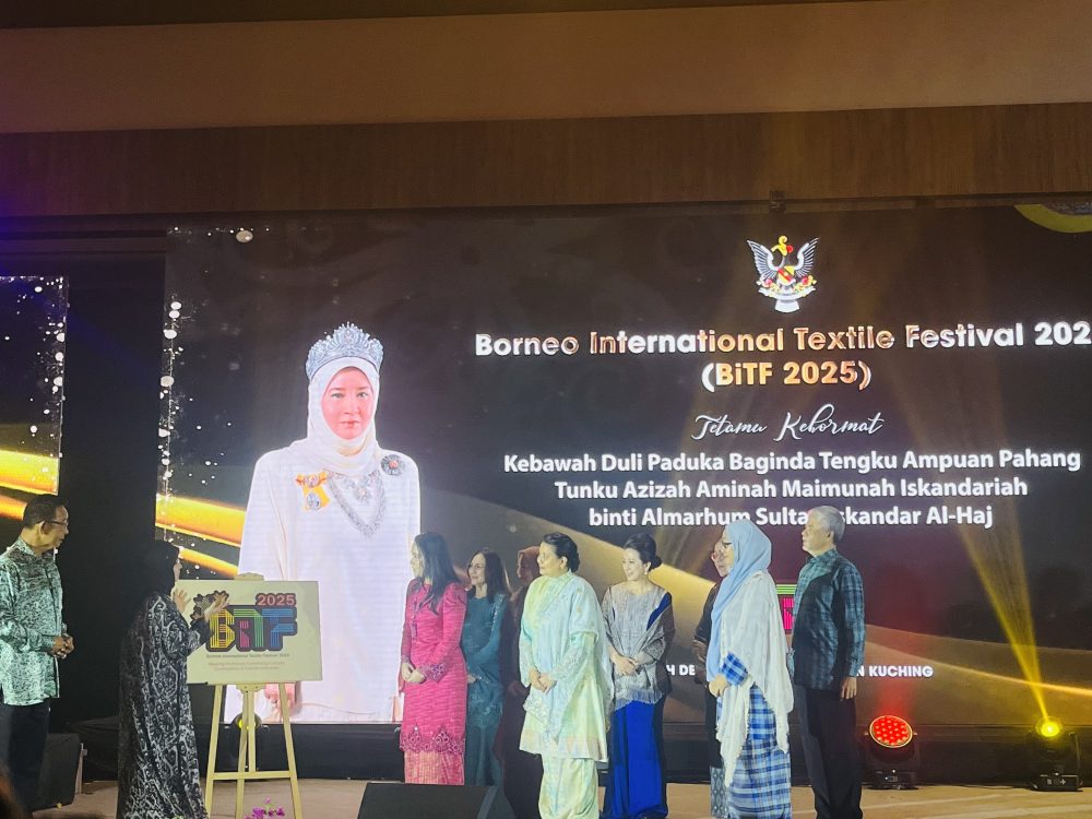 KEBAWAH Duli Paduka Baginda Tengku Ampuan Pahang, Tunku Azizah Aminah Maimunah Iskandariah Almarhum Sultan Iskandar Al-Haj berkenan menyempurnakan Majlis Perasmian Festival Tekstil Antarabangsa Borneo (BiTF) 2025 di sebuah hotel terkemuka di Kuching sambil disaksikan Menteri Pelancongan, Industri Kreatif dan Seni Persembahan, Dato Sri Abdul Karim Rahman Hamzah.