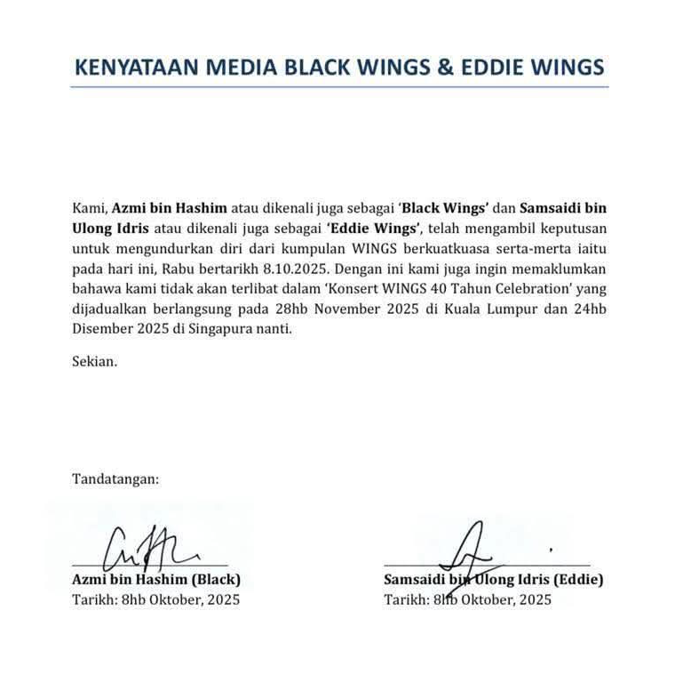 “Kami, Azmi Hashim atau dikenali juga sebagai Black Wings dan Samsaidi Ulong Idris atau dikenali juga sebagai Eddie Wings, telah mengambil keputusan untuk mengundurkan diri dari kumpulan Wings berkuat kuasa serta-merta iaitu pada hari ini, Rabu, 8 Oktober 2025,” menurut kenyataan itu.