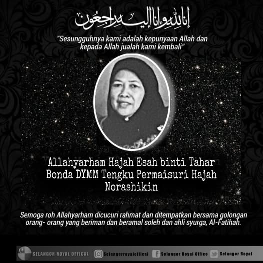 SHAH ALAM: Bonda kepada Tengku Permaisuri Selangor Tengku Permaisuri Norashikin, Esah Tahar meninggal dunia pada 5.15 pagi tadi.