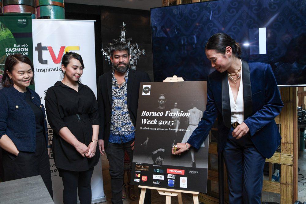 PENGASAS Borneo Fashion Week (BFW) 2025, Stephanie Alcantara (kanan) menyempurnakan gimik pelancaran BFW 2025 edisi keempat yang bertemakan “Fashion With Purpose” baru-baru ini. Foto BERNAMA