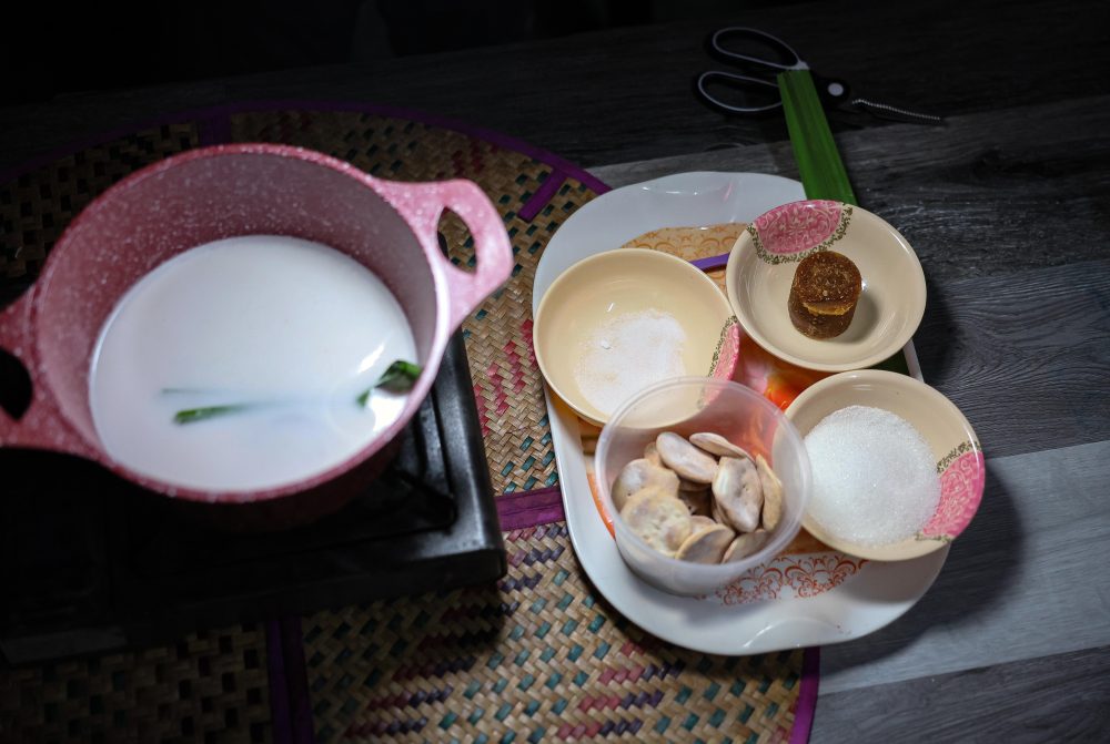 Mengenai penyediaan juadah terbabit, ibu kepada lapan cahaya mata itu berkata antara bahan asas yang diperlukan ialah santan segar, gula kabung, daun pandan, garam dan biskut kapal.
