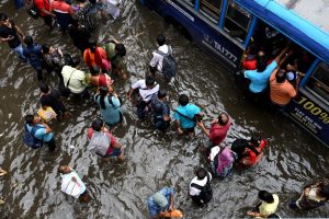 PENUMPANG meredah jalan yang dipenuhi air selepas hujan monsun lebat di Kolkata pada 23 September 2025 lepas....