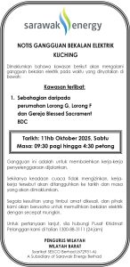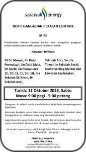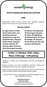 Jumaat, 10-11 Oktober 2025, SEB, Notis Gangguan Bekalan Elektrik Miri-Piasau IKLAN Jumaat, 10-11 Oktober 2025, SEB, Notis Gangguan Bekalan Elektrik Miri-Piasau Utusan Sarawak 8 hours ago Read More