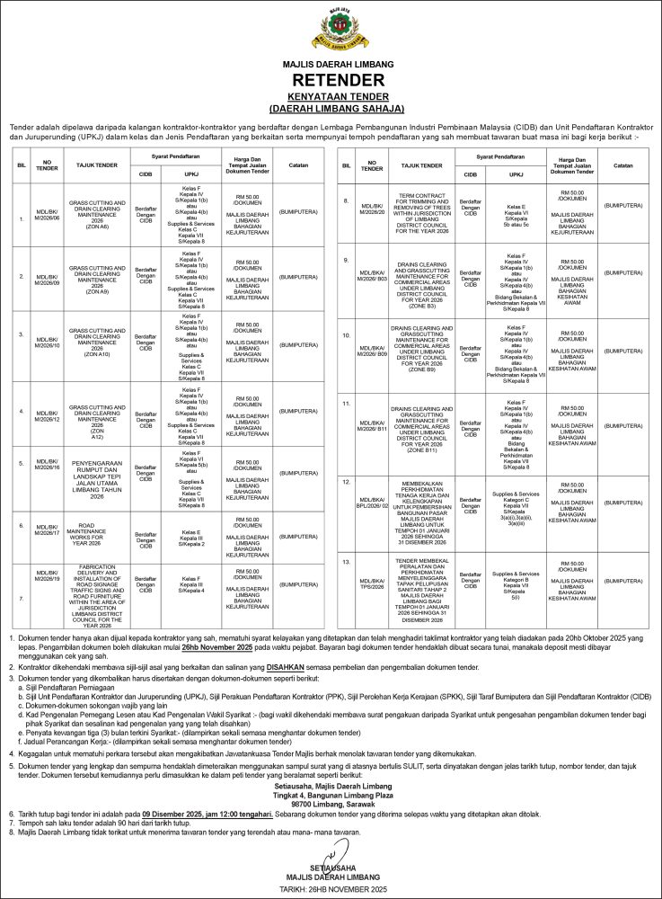Rabu, 26 November 2025, Majlis Daerah Limbang, Kenyataan Tender (Daerah Limbang Sahaja) IKLAN Rabu, 26 November 2025, Majlis Daerah Limbang, Kenyataan Tender (Daerah Limbang Sahaja) Utusan Sarawak 19 hours ago Read More