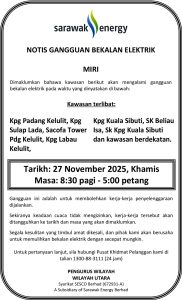 Rabu 26 November 2025, SEB Notis Gangguan Bekalan Elektrik Miri (Kpg Lusut) IKLAN Rabu 26 November 2025, SEB Notis Gangguan Bekalan Elektrik Miri (Kpg Lusut) Utusan Sarawak 21 hours ago Read More