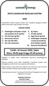 Sabtu, 10 Januari 2026, SEB Notis Gangguan Bekalan Elektrik Miri (Jln Bakam – Sg Rait) IKLAN Sabtu, 10 Januari 2026, SEB Notis Gangguan Bekalan Elektrik Miri (Jln Bakam – Sg Rait) Utusan Sarawak 1 day ago Read More