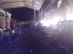 KUCHING: Kebakaran longgokan tayar yang berlaku di Batu 9.00 malam tadi, merebak dan memusnahkan dua kilang berhampiran...
